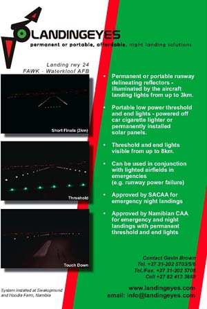 The Landing Eyes night landing system provides a clear, illuminated airfield delineating system for runways situated in rural or remote areas where there is no electricity available. The Landing Eyes System does not replace but rather complements conventional runway lighting in emergency situations when they are not available ( e.g. lightning strikes or theft) |